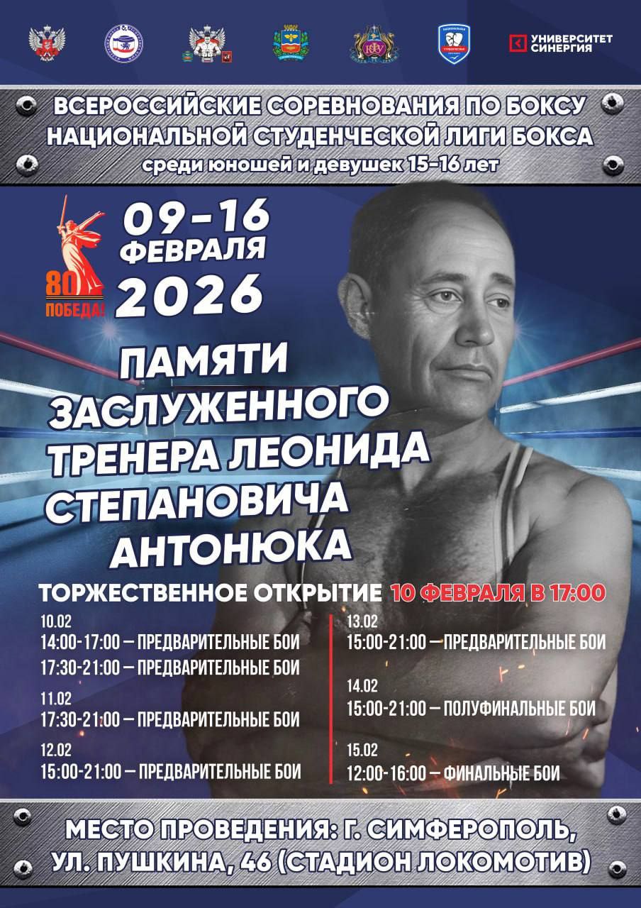 С 9 по 16 февраля 2026 года в городе Симферополе состоятся Всероссийские соревнования по боксу Национальной студенческой лиги бокса, посвящённые памяти Заслуженного тренера Леонида Степановича Антонюка.