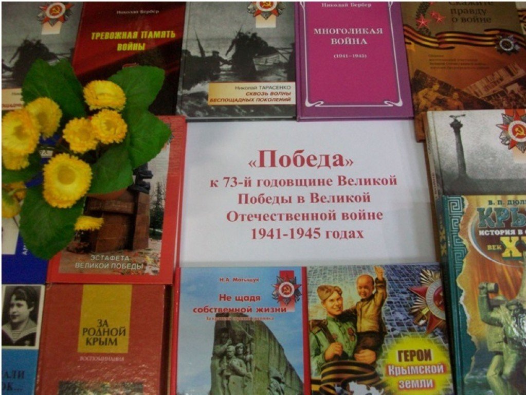 С 04.05 - 17.05 проходит выставка «Победа» к 73-й годовщине Великой Победы в Великой Отечественной войне 1941-1945 годах, на которой представлены книги о войне. Желающие могут взять домой почитать понравившиеся книги.